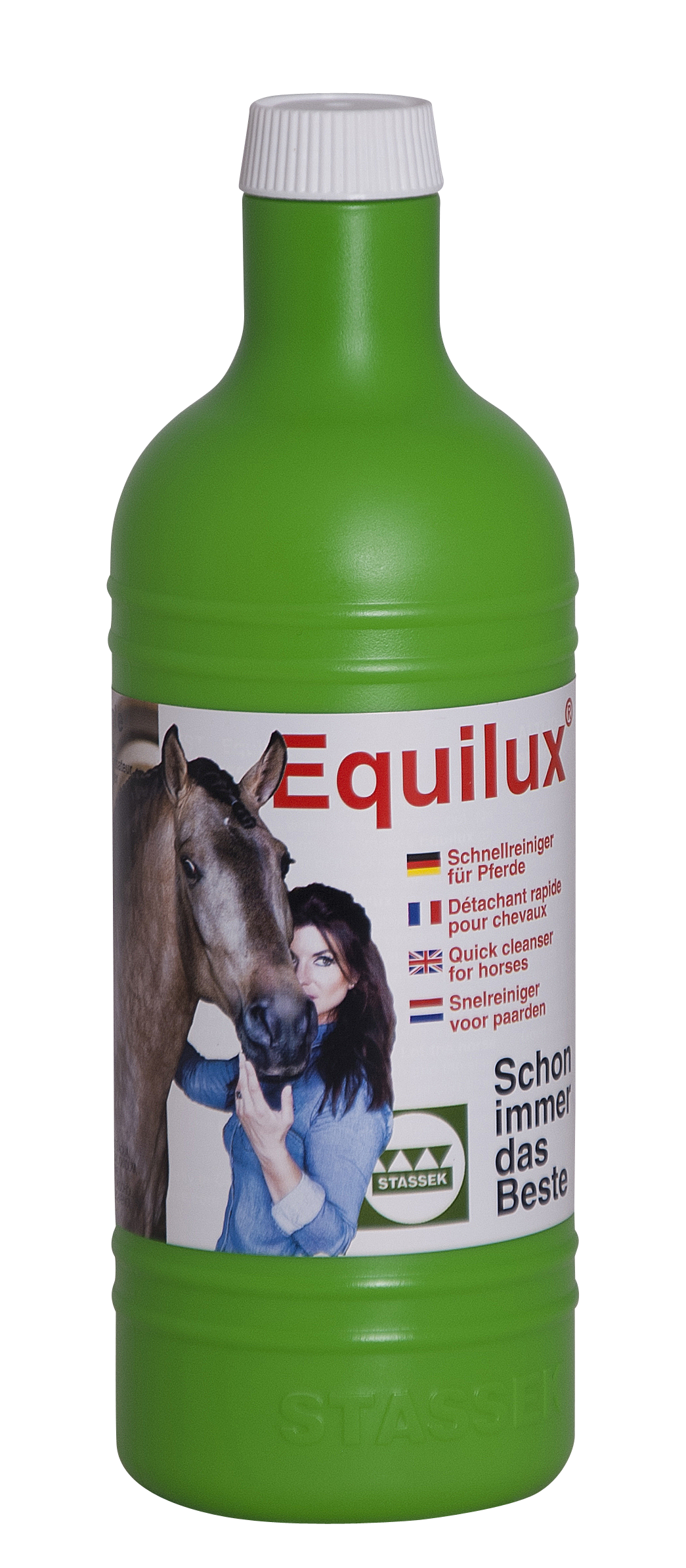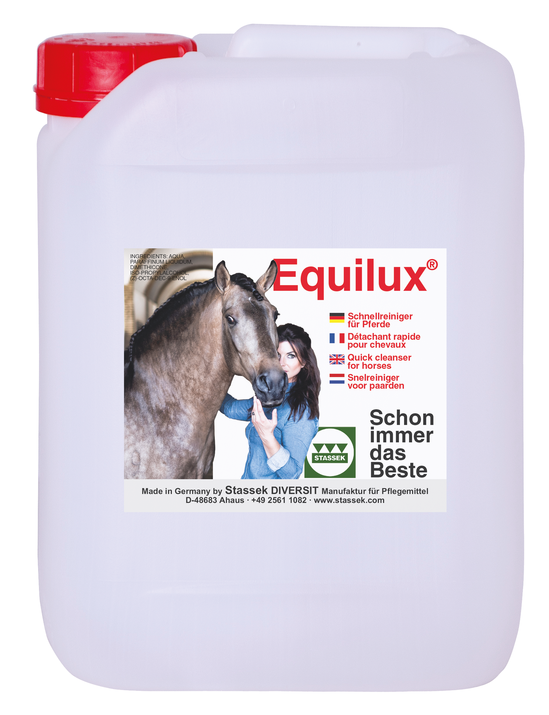 Das Pferd braucht nicht vorgewaschen zu werden. EQUILUX ist gebrauchsfertig. Es wird abschnittsweise auf das trockene, grob vorgereinigte Fell aufgesprüht oder mit einem Schwamm aufgetragen. Dann kurz mit einem saugfähigen Tuch oder Küchenpapier nachreiben. Besonders hartnäckige Flecken können ein zweites Mal behandelt werden. Nach dem Trocknen nochmals mit einer Wurzelbürste kurz überbürsten und der Fleck ist verschwunden. Die Reinigung von Mähne und Schweif erfolgt in gleicher Art und Weise.