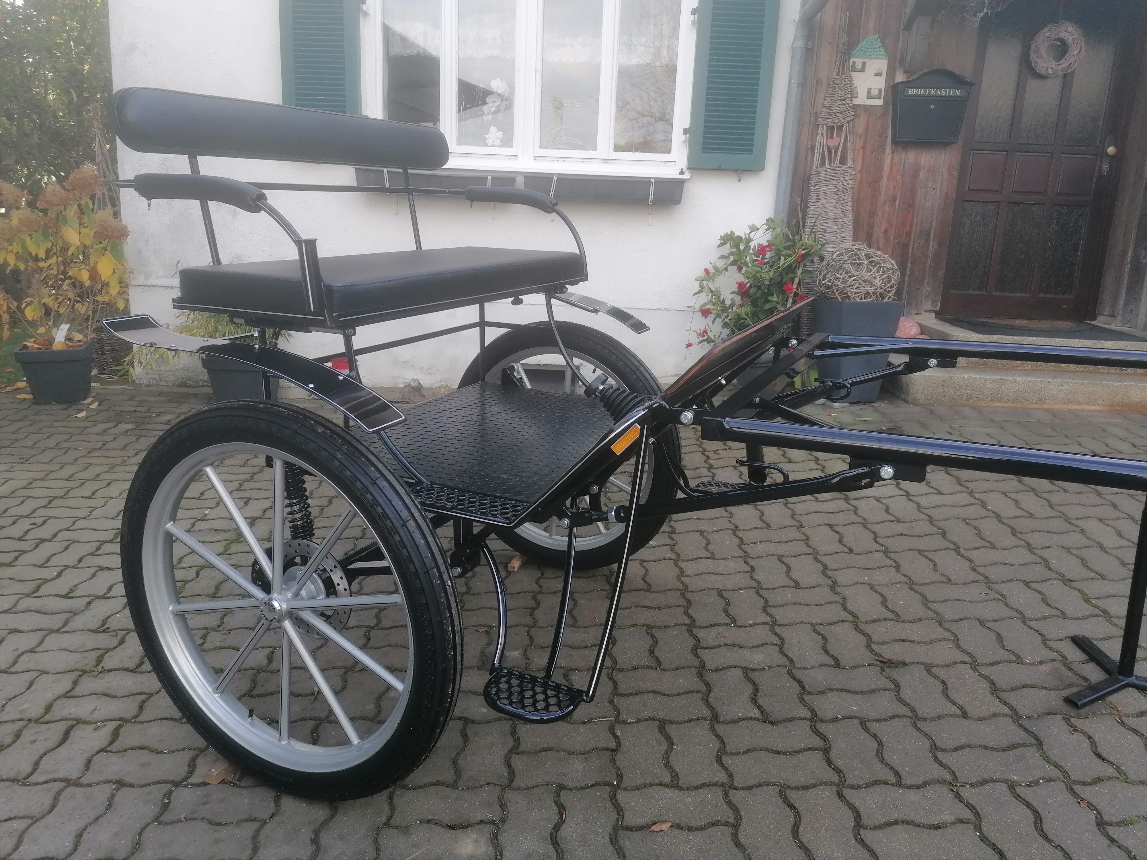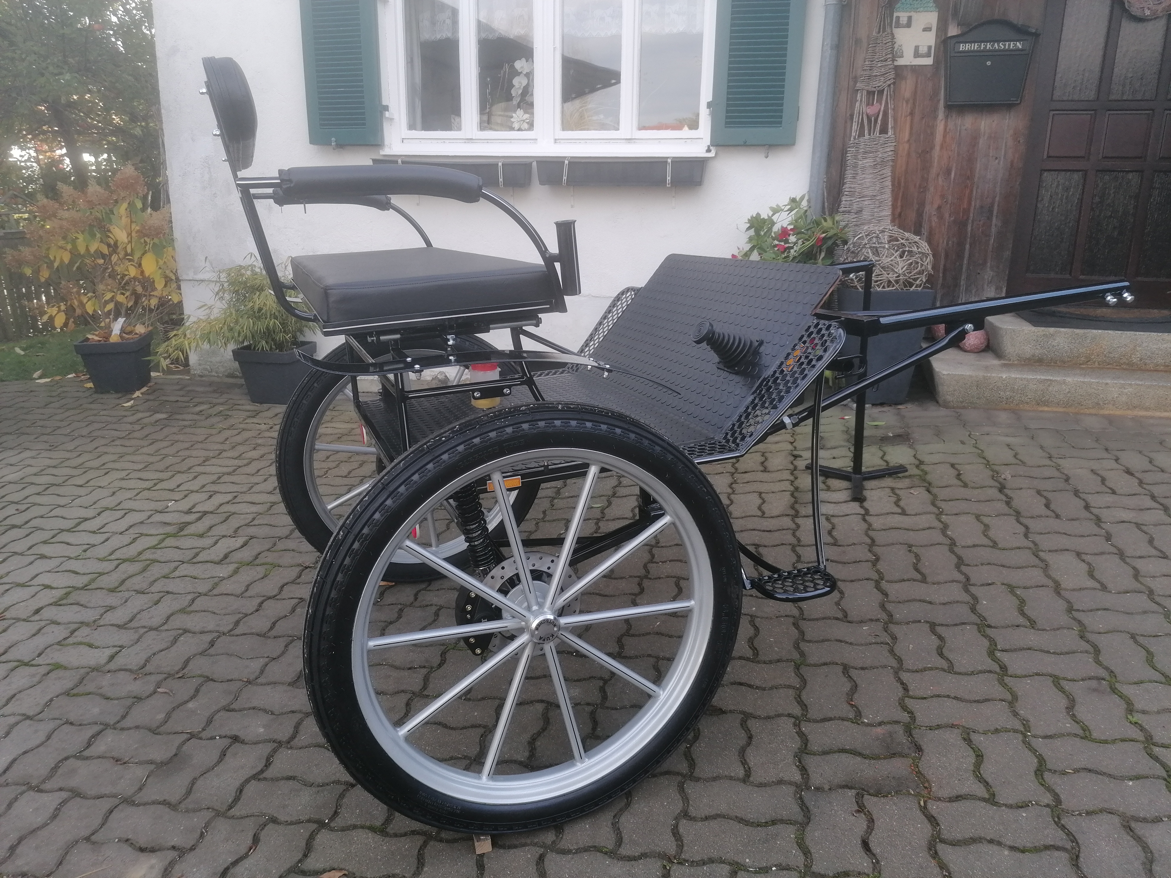 Exklusiver Sulky mit dem Sie durch dick und dünn fahren können, der auch lange Distanzfahrten und Fahrten im Gelände stand hält. Komfortable härteverstellbare Achsfederung! Der Sulky hat folgende Ausstattung •stabile, luftbereifte Kutschenräder, keine Drahtspeichen usw. •Fußbremse •Komfortable Achsfederung •Sitzbank für 2 bzw. 3 schmale Personen •Sitzaufbau gefedert, und in der Höhe verstellbar, für genaueren Gewichtsausgleich •Wasserfestes Fußbrett •Kotflügel für Spritzschutz •Scheren bzw. Landen in der Länge, Höhe und Breite verstellbar •Farbwahl nach Ihren Wünschen, aus RAL Farbkarte Grundpreis 1900,00 EUR Für Stauraumkiste offen oder geschlossen, geschlossene Sitzbank oder größere Räder (wie abgebildet 100 EUR), berechnen wir einen Aufpreis. Gerne unterbreiten wir Ihnen ein persönliches Angebot für Ihre Wunschkutsche ! Lieferzeit ca.6 Wochen Der Sulky wird nach Ihren Wünschen und passend für Ihr Pony oder Pferd gebaut, profitieren Sie aus unserer 30 jährigen Erfahrung im Kutschenbau, unser Motto, vom Fahrer - für den - Fahrer. Wir beraten Sie gerne, Sie kaufen beim Handwerksbetrieb bzw. im Fachgeschäft in deutschland mit Ersatzteilgarantie!!